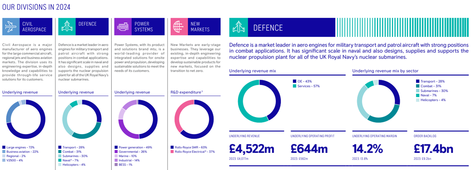 군용 전투기 엔진과 핵잠수함용 원자력 추진기 그리고 선박용 가스터빈을 생산한다. 전체 사업 중 비중은 약 25% 이며, 2024년 기준 매출액은 10조 원이 조금 넘는다. 대표 상품은 유로파이터 타이푼용 제트엔진인 유로젯 EJ200 과 Adour, Pegasus 등이며, 핵잠수함용 원자로는 PWR3, 선박용 가스터빈 엔진은 MT30 등이 있다.
