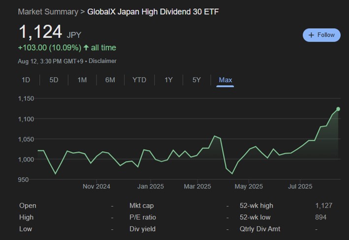 2024년 8월, 일본 증시에 상장된, 고배당 기업 상위 30개를 모아 놓은 ETF. 시가총액이 큰 일본 대기업 중에 배당금을 지급하고도 현금자산이 남는 곳만 선정한 뒤, 연간 배당률이 높은 순위를 매겨 상위 30개를 담는다. 비중은 배당금 총액을 기준으로 최고 10% 이내로 할당한다. 배당금은 연 4회 지급. 리밸런싱은 연 2회. 연배당률은 3 ~ 4%.