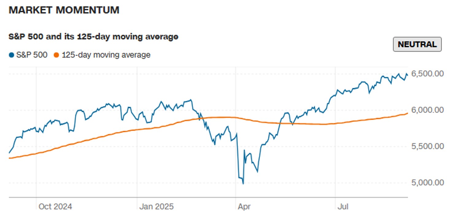 미국 증시를 대표하는 S&P 500 지수를 최근 반년간 평균과 비교한 후, 평균보다 위에 있으면 현재 시장이 상승 모멘텀이 크다고 해석. 평균보다 아래에 있으면 그 반대로 해석한다.