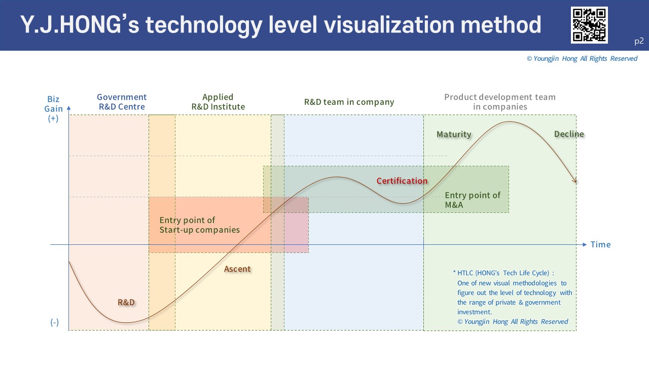 일단, 어디 다른 데에도 이런 게 있는지 확인을 해본 건 아니니, 적절한지 모르겠으나, 이 그래프의 이름은 필자의 성씨를 따다가 HTLC(HONG’s Technology Life Cycle)로 해봤다. 나중에 바뀔지는 모르겠다. HTLC 그래프의 가로축은 ‘시간(time)’이고, 세로축은 ‘사업적 이득(business gain)’ 혹은 '금전적 가치' 정도의 의미이다. 각 축을 기준으로 2차원 평면 위에는 매트릭스 형태로 구간별 액터(actor)와 투자 진입 구간을 표시하였다.