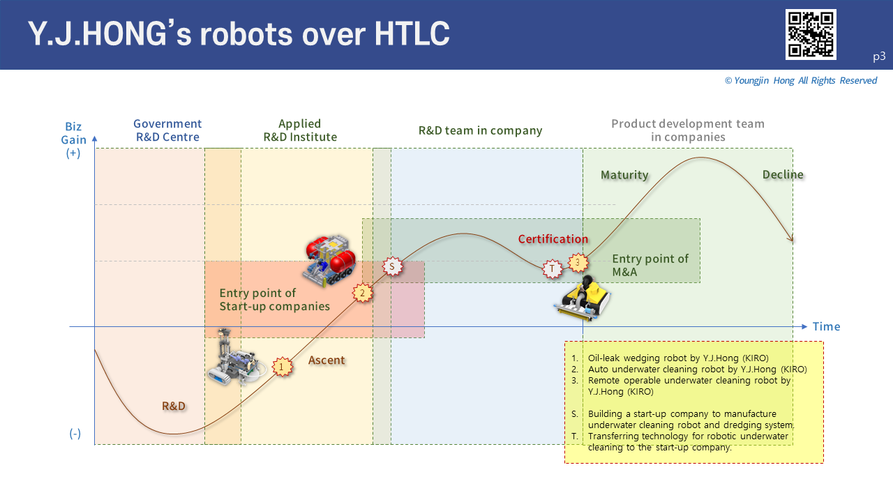 - 3번 remote operable underwater cleaning robot (원격운전 수중청소로봇)의 경우, ”이미 공공자금 투자 단계를 지나, 국가 공인기관의 기술인증이나 시장에서의 기술검증 단계를 지나서 기술의 성숙 단계”로 이제 막 진입했다는 의미이다.