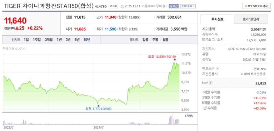 국내 증시에 상장된 과창판 ETF 의 구성종목 중 상위 10개와 그 비중은 아래와 같다 (2025년 11월 기준).