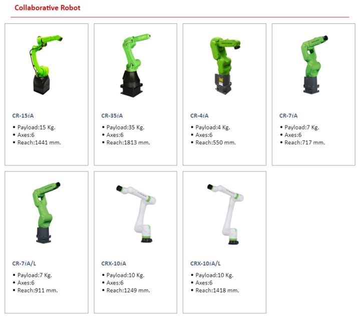 모든 제품에 노란색을 도색하여 어디에 있더라도 눈에 띄는 이미지를 가지고 있는 Fanuc 로봇이 최근에 협동 로봇 제품을 출시하면서, 협동로봇 제품에는 녹색과 흰색 도색을 적용하여 판매하고 있다. 협동 로봇 제품의 핵심부품인 토크센서(힘센서)도 자체 기술로 보유하고 있으며, 로봇의 눈 역할을 하는 비전 센서(vision sensor) 기술도 자체 보유하고 있다. 최근에는 보유하고 있는 비전 센서에 인공지능(AI) 기술을 탑재하는 연구개발을 진행 중 이다.