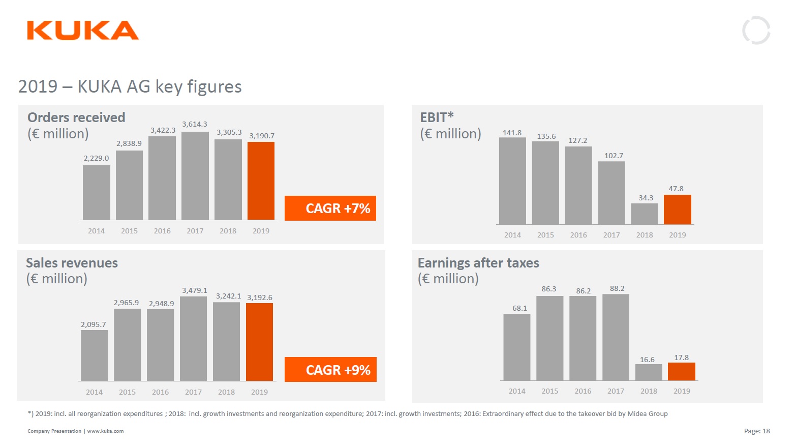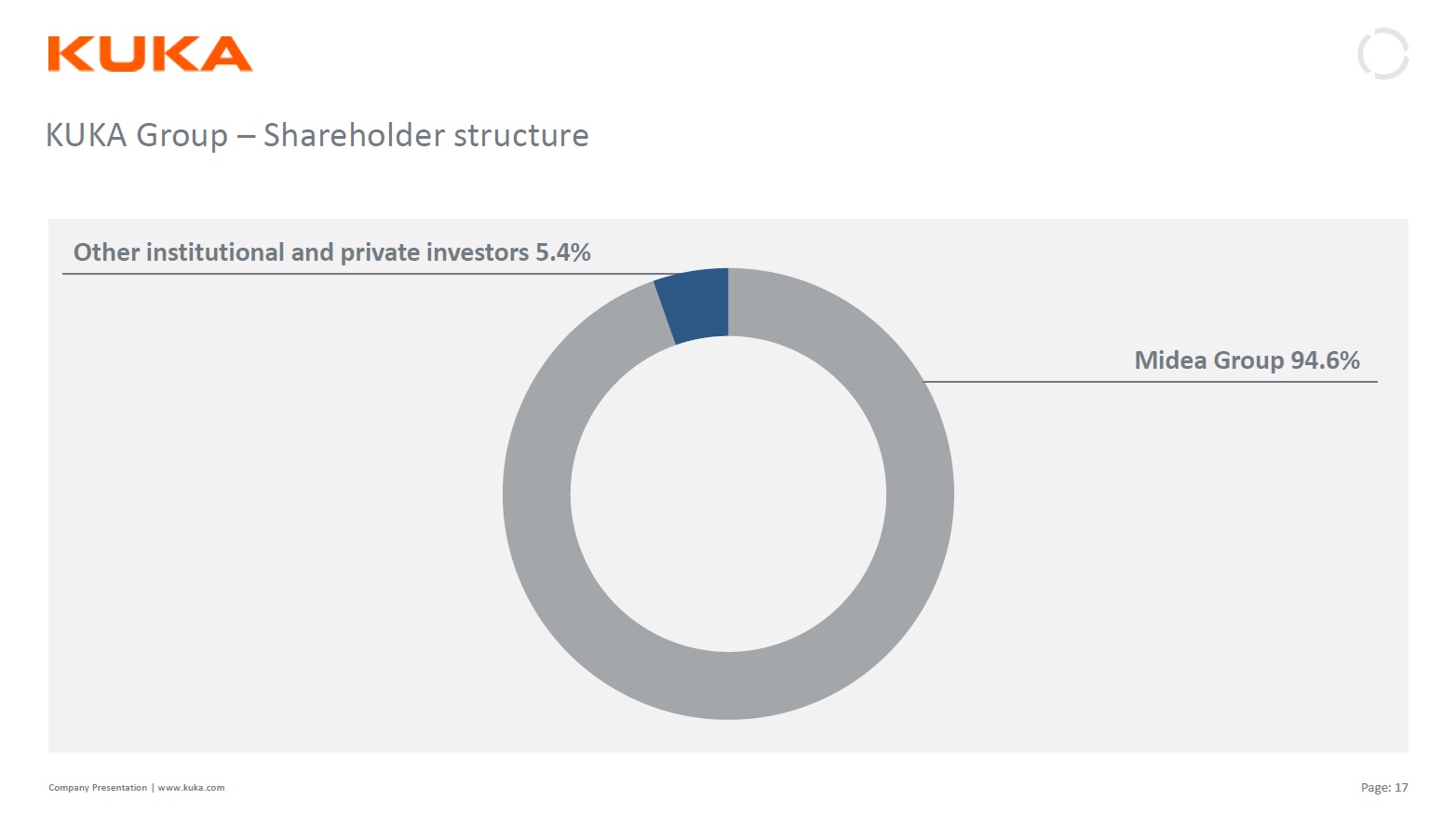 아직 본사는 독일 남부의 아우구스브르크(Augsburg)에 있다고 하지만, 경영진의 인사권을 중국 모기업이 가지고 있기 때문에, 지금의 KUKA는 중국 회사로 보는 것이 옳다. (중국 모기업도 독일 KUKA를 인수한 뒤로 매출이 하향세로 전환됨)