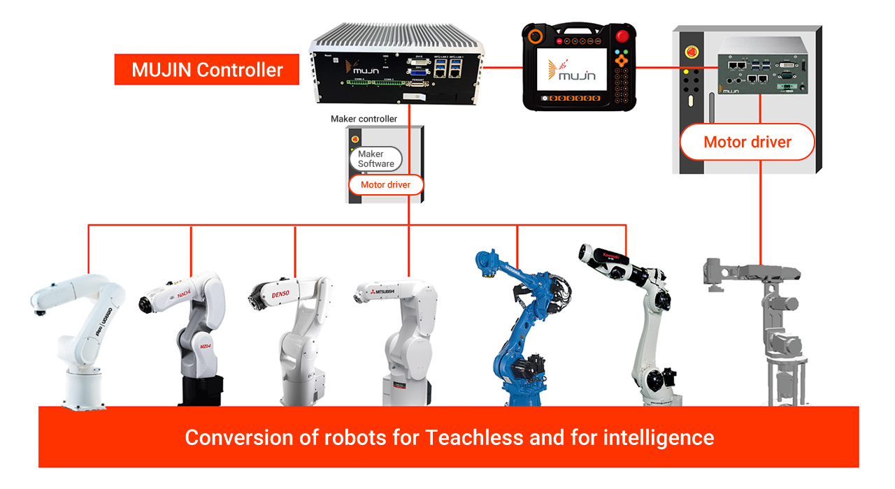 MUJIN은 모든 산업용 로봇을 제어할 수 있는 범용적 제어기 플랫폼 기술을 가지고 있는 것으로 알려져 있으며, 한번 구축된 로봇 생산 공정은 어떤 로봇 제품으로 하드웨어가 변경되든, 공정을 변경할 필요가 없다고 한다. 더구나 제어기 자체에 3D 시뮬레이터가 내장되어 있어서, 로봇의 동작을 교시한 후, 로봇을 실제 동작시키지 않더라도 제어기 상에서 가상으로 로봇을 제어해 볼 수 있고, 빠른 수정과 자동 모션 플래닝을 통해, 훨씬 빠르게 로봇 동작을 만들 수 있다고 한다.