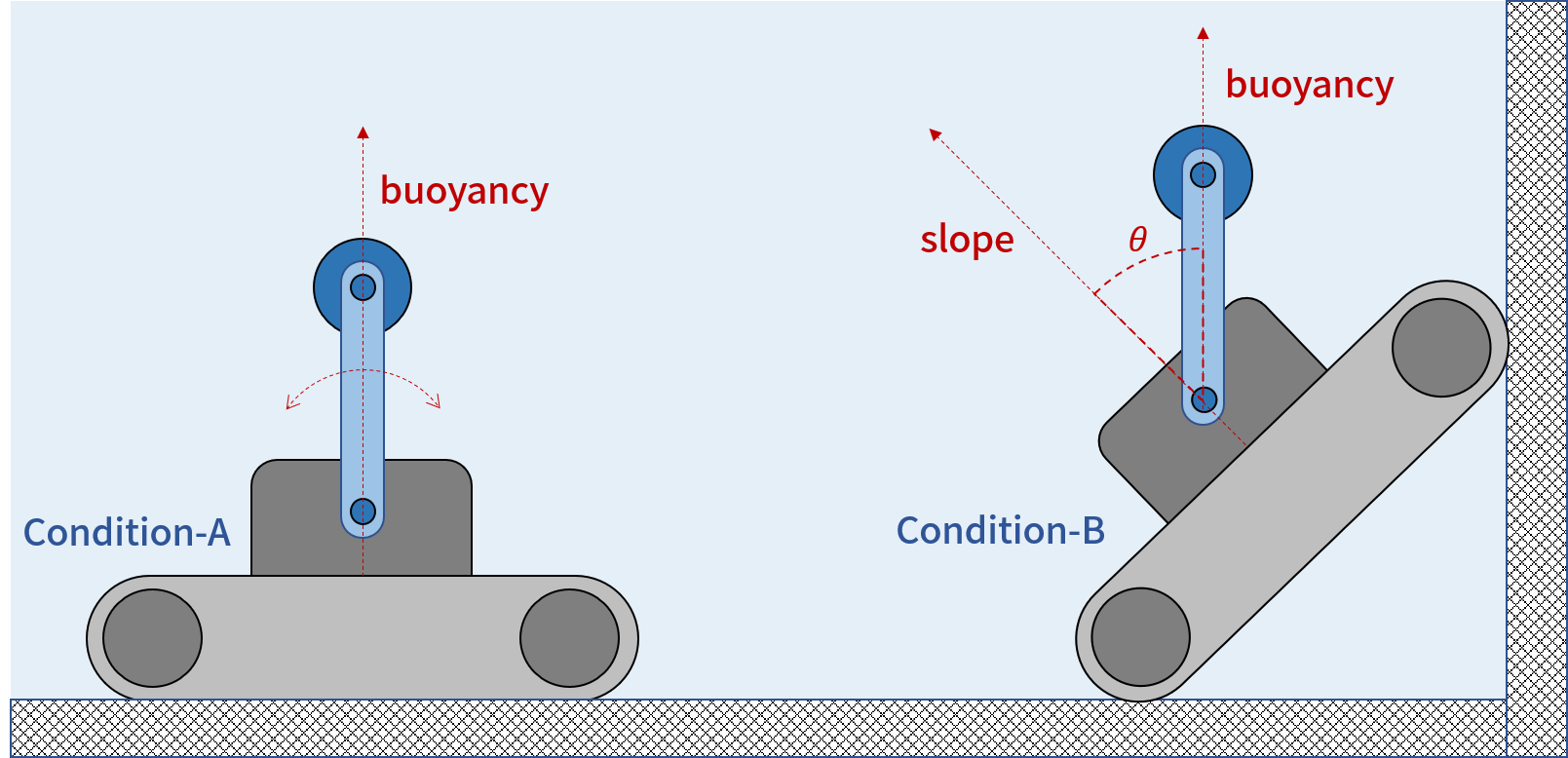 원리는 간단했다. 위 그림에서 파란색의 손잡이는 수영장 바닥을 기어 다니는 로봇에 연결되어 있다. 손잡이 맨 윗부분은 부력이 있어서 항상 위를 향하고 있다. 수영장 청소 로봇은 수영장 바닥을 이리저리 이동하면서 청소를 하고 (condition-A), 수영장 벽에 닿으면, 주행 바퀴에 감겨 있는 고무트랙의 마찰력으로 수영장 벽을 타고 올라가려고 한다 (condition-B).