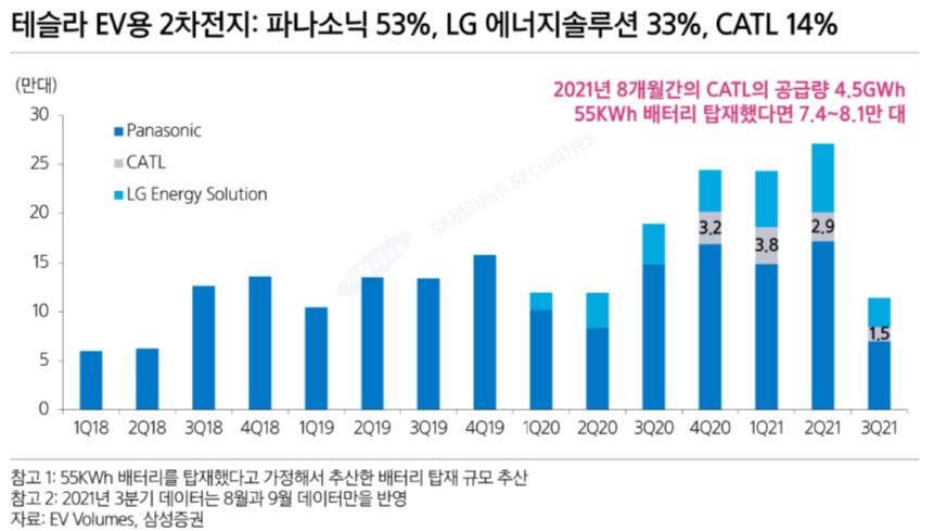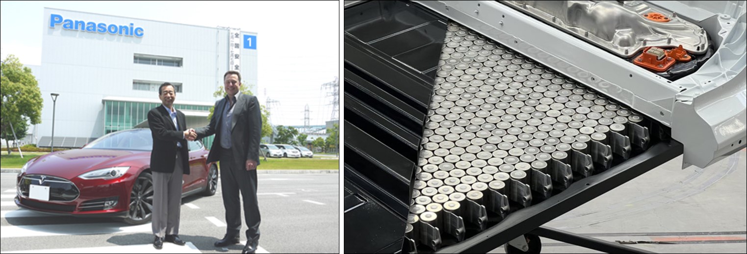 지금은 전기차(EV) 하면 제일 먼저 떠오르는 테슬라(Tesla) 자동차에 일론 머스크 (Elon Musk)가 사장으로 부임한 건 2007년도 이다. 당시 일론 머스크는 자사의 전기차에 탑재할 배터리를 안정적으로 공급할 수 있는 업체를 물색해야만 했는데, 그 당시에는 일본의 파나소닉 이외에는 달리 선택할만한 다른 전기차용 배터리 대량생산 업체가 없었다 (중국 CATL 은 아예 세상에 없었고, 한국 LG 도 2차전지 양산 초기 기술 수준). 당시 파나소닉은 더 가벼우면서도 오래 사용할 수 있는 노트북용 원통형 2차 전지를 대량으로 생산할 수 있는 양산 체제를 보유하고 있었는데, 일본 노트북 브랜드들의 세계 시장 점유율이 하락세로 돌아서면서 배터리 생산량 조절에 고민이던 중, 테슬라의 제안을 받고 기존 노트북용 원통형 배터리를 그대로 납품하기로 한 것이 현재까지도 테슬라가 원통형 배터리를 사용하는 계기가 되었다고 한다. 이렇게 해서 테슬라와 배터리 공급계약을 한 파나소닉은 약 2년간 시설투자를 통해 2009년부터 본격적으로 납품을 시작하게 되었고, 2015년에는 미국 네바다에 새로운 테슬라 생산공장이 지어지면서, 아예 테슬라 공장 안으로 파나소닉이 들어가 배터리 생산을 하게 되었다. (※ 2015년 당시 테슬라는 공장 시설과 공간을 현물 투자하고, 파나소닉은 배터리 생산설비를 투자하였는데, 당시에 테슬라 판매량은 현재와 비교하면 아주 미미했었기 때문에, 일본 파나소닉 입장에서는 미래를 본 투자였지, 실제 사업성은 없었다고 함)