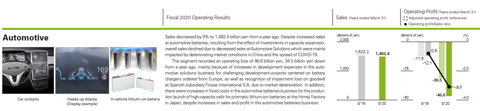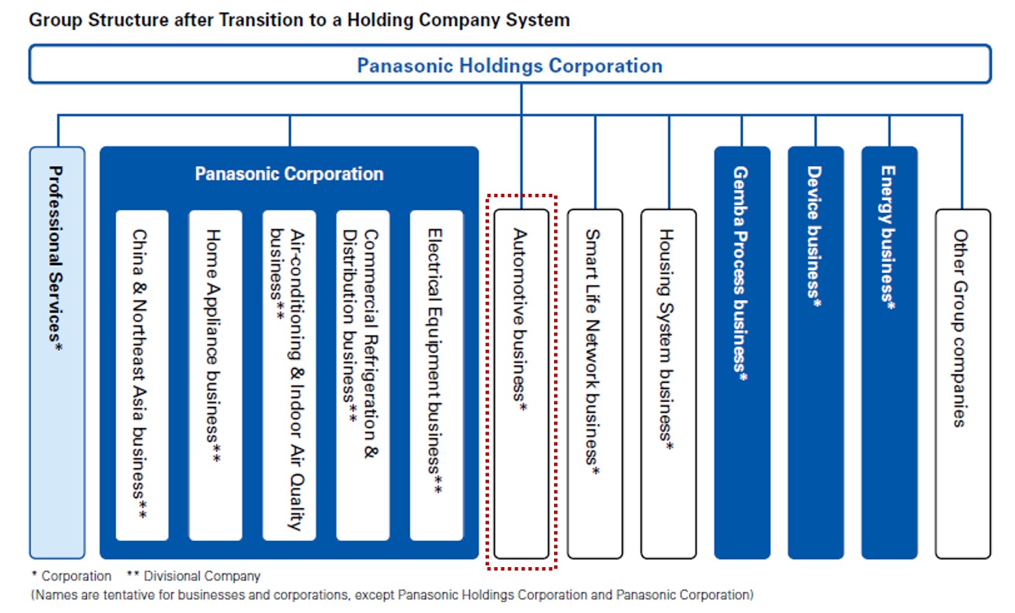 파나소닉의 2020년 annual report 에는 2022년 4월까지 지주회사를 통한 계열사 재편 계획이 나와 있는데, 차량용 배터리를 포함한 자동차 사업부를 파나소닉으로부터 분사하여 별도 계열사로 만들겠다고 한다. 아마도 한국의 LG화학이 배터리 사업부를 LG에너지솔루션으로 분사하고, SK이노베이션이 배터리 사업부를 분사하겠다고 발표한 것과 같은 맥락으로 보인다. (※ 일본 기업은 이런 사업 분사 계획을 무려 2년전에 공개)