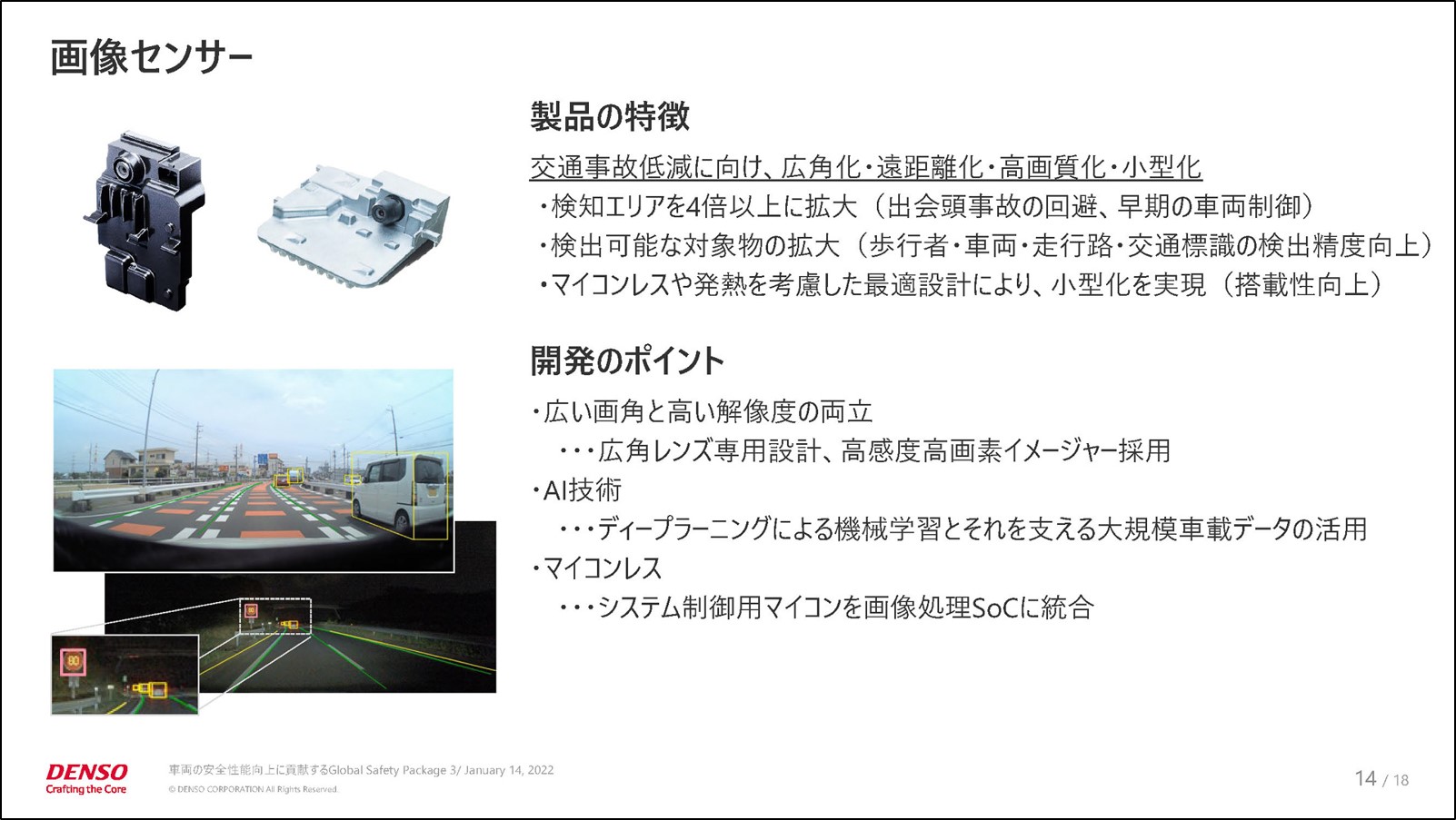 ▷ Denso 영상 센서 내용요약 : 기존 영상센서 대비 4배 광각으로 보행자, 차량, 주행로, 교통표지판 인식이 AI 기술을 추가하여 더욱 고감도로 가능하며, 영상센서 칩설계 개선을 통해 소형화 및 발열도 감소시켜, 기존 영상센서 대비 전기차 등에 탑재하기 쉽고 가격이 저렴해짐.