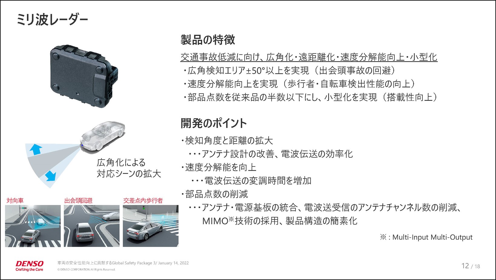 2022년 1월 14일, 일본 Denso 는 GSP3 (Global Safety Package 3) 를 위한 자율주행차와 안전운전 보조장치용 Radar (레이더) 기술을 공개했다. 해당 기술은 일본 Toyota 자동차에 이미 적용된 TSS 2.0 (Toyota Safety Sense) 의 업그레이드 버전으로 기존 기술이 대부분 카메라를 이용한 영상 데이터를 기반으로 하는데 반해, 새로 소개된 차량용 안전센서는 미국 반도체 회사 Texas Instrument 사의 mmWave 기술과 유사한, 밀리미터파 (millimeter wave) 를 이용한 레이더 기술로, 카메라와 달리 비나 눈이 오는 악천후 날씨에서도 차량 전방 상황을 감지할 수 있고, 인식 거리와 감지 범위 (각도) 와 측정 정밀도도 전파 변조기술을 이용하여 대폭 개선하였다고 한다. 또한 레이더의 저가화와 소형화를 위해 휴대폰에 적용되는 안테나 기술인 MIMO 기술을 적용하여 동일 성능의 레이더에 비해 크기와 비용을 절반이하로 구현할 수 있었다고 한다.