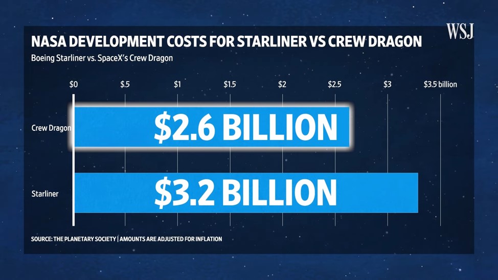 현재까지 우주 배달 서비스의 주요 고객은 NASA이고 주요 목적은 ISS (국제 우주 정거장) 으로의 과학자를 보내고 데려오는 일과 물자 공급 인데, 이 사업에서도 Space X 는 가장 경쟁력이 있는 것 같다. 아래 사진은 미국 방송에서 비교한 ISS 로 사람을 보내는 서비스에 대한 Space X 와 보잉(Boeing)의 Starliner 와의 가격 비교 그래프이다.