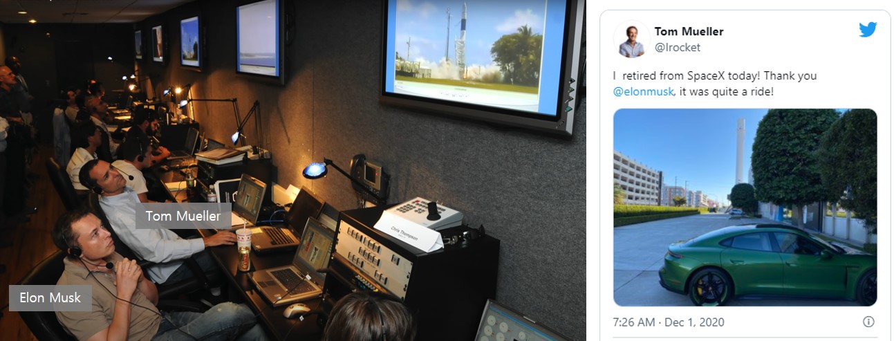 ※ 로켓 엔지니어링 분야 전문가들, 특히 로켓에 미친 guru들은 현재 Space X의 기술적 성공은 자본가인 Elon Musk 보다는 Space X의 창립 맴버 중 한명인, 로켓 엔지니어 Tom Mueller (1961년생) 의 역할이 아주 컸다고 생각하는 것 같다. 그는 최초의 Merline 엔진 개발자이며, 2016년 Space X의 CTO (최고 기술 책임자)가 된 뒤, 2020년 11월 퇴사했다.
