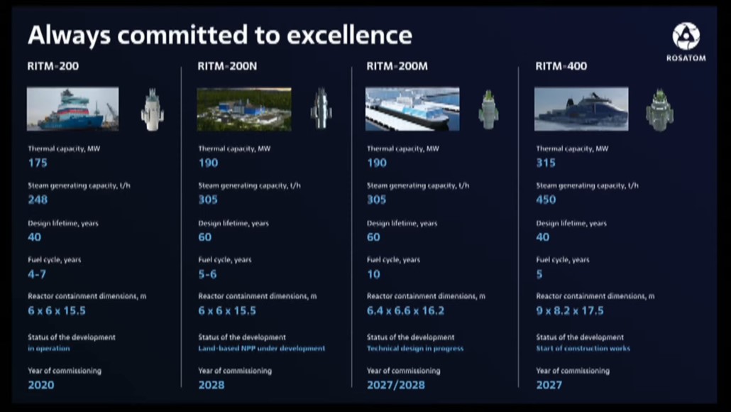 과학기술 분야에서 실제보다 대체로 저평가 되어 있는 러시아는 SMR 원천기술을 가지고 있고, 이 분야에서 현 시점 가장 앞서 있다고 추정된다. 러시아 모스코바에서 동쪽으로 약 200km 떨어진, Nizhny Novgorod 에 본사가 있는 OKBM Afrikantov 는 1972년 군사용으로 개발한 SMR, KLT-40 의 기술을 개량하여, 2016년 기존 KLT-40S (KLT-40의 개량형) 의 원자로 무게를 절반 이하로 줄이고, 흔들림이 심한 선박에서도 안전하게 사용이 가능하도록 안전성을 대폭 향상시킨, RITM-200 을 민수용으로 개발하였다. RITM-200 은 폭 3.3m, 높이 7.3m, 무게 147.5 ton 이며, 출력은 175 MWe. 미국 NuScale Power사의 SMR 보다 출력은 2.3배 좋고, 무게는 4분의 1 이상 가볍고, 크기도 절반 정도이며, 거기다 이미 제작되어 현장 검증까지 완료된 상태이다.
