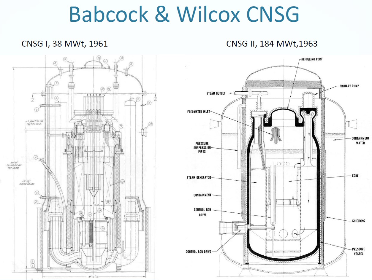 SMR 기술은 전혀 새로운 기술이 아니다. 일부에서 뭔가 새로운 원전 기술이라고 선동하는 사람이 있다면, 사기꾼이라고 생각하면 된다. 이미 70~80년 전부터 군용 선박이나 잠수함에 탑재할 목적으로 개발되어 실제 적용에 성공한, 검증된 기술이기 때문이다. 즉, 군사용 원자로 기술이 민수용으로 변형된 것이 SMR 이며, 민수용으로 사용되기 위해 적당한 크기로 줄이고, 안전 확보 기술이 강화된 것뿐이다. 미국 해군의 핵추진 엔진 관련 자료를 보면, 이미 1939년부터 선박용 SMR 이 개발되어 사용되었고, 2차 세계대전이 종료된 후 기술 완성도가 급격히 올라가 성능과 안전성이 크게 개선되었다고 한다. 아래 그림의 SMR 은 미국 Babcock & Wilcox사가 이미 1961년과 1963년에 선박용으로 만든 SMR 이다.