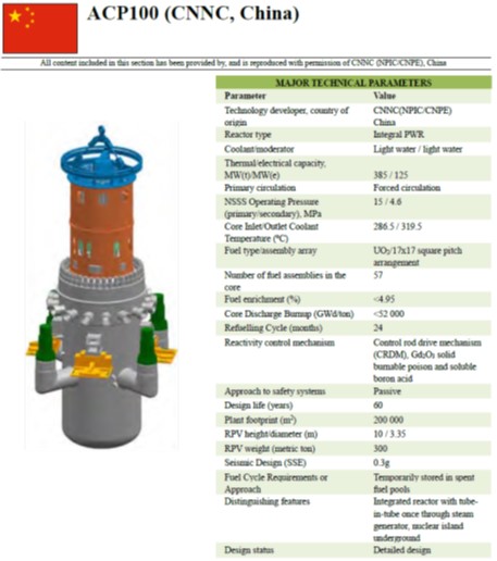 잘 알려져 있지 않지만, 2016년 4월 IAEA 에서 세계 최초로 사용 승인 (GRSR: Generic Reactor Safety Review) 을 받은 상용 SMR 은, 중국 CNNC(중국 원자력 공사) 에서 개발한 ACP100 (일명 Linglong One) 이다. ACP100 은 발전용량 126.5 MWe 급이라고 하며, 이미 중국의 하와이라는 하이난 섬에 있는 Changjiang 원전에 시험 적용 중이라고 한다. 그리고 현재 남중국해 분쟁지역 (베트남, 필리핀 인근 해상 지역) 인근에 여러 대의 ACP100 을 적용한 원자력 발전소를 2025년까지 완공 예정이라고 한다. (출처: 2021년 7월 13일, China launches first commercial onshore small reactor project). 현재도 추진 중인지 확인이 어렵지만, 2015년 10월에는 영국의 해양 구조물 품질인증 전문 업체, Lloyd's Register 와 기술협력 계약을 하고 중국의 ACP100 을 개조한 ACP100S 를 적용하여 해상 부유식 원전 시설도 구축하기로 했다고 한다. 현재 중국은 ACP100 이외에도 DHR-400 (일명 Yanlong, 400 MWe 급), HTR-PM (4세대 원전기술 적용, 210 MWe 급) 등의 SMR 이 개발되어 시험운전 단계에 있다.