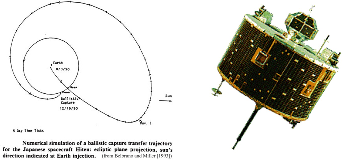1970년 첫 우주궤도 진입 성공 이후 계속 기술을 발전시켜, 1990년 1월에는 세계에서 2번째로 달 궤도에 자체 개발 인공위성, Hiten 을 보내는 데 성공한다. 당시 일본의 비교적 작은 우주 발사체 로켓으로도 달 궤도에 위성을 보내기 위해, 타원형 스윙바이 궤도를 미국의 Belbruno 교수, Miller 교수와 제안하게 되었고, 이 궤도를 활용하여 인공위성을 달 궤도로 진입시키는데 성공한다. 현재도 이 궤도는 Belbruno-Miller trajectory 라고 명명되어 사용되고 있다.