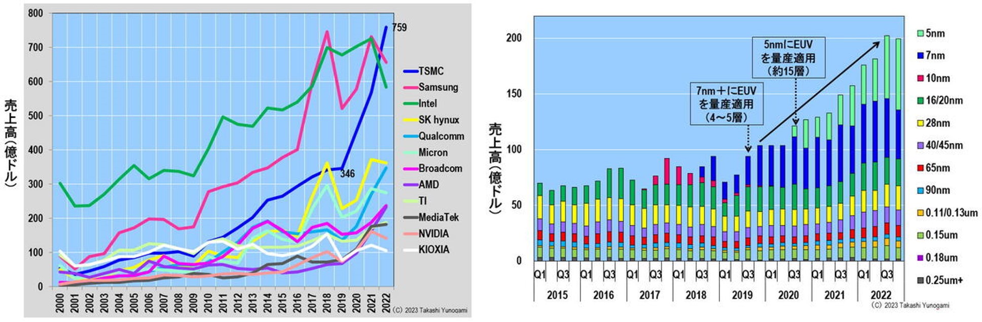 그리고 이러한 반도체 미세공정 생산경험을 통해 탄생한 장비가 세계 최초의 7 나노와 5 나노 공정용, EUV 리소그래피 장비라고 한다. EUV 반도체 장비 생산은 네덜란드 ASML 이 하고 있지만, ASML 이 아직 세상에 있지도 않은 반도체 공정을 상상해서 EUV 장비를 자체 개발한 것이 아니다. ASML 은 TSMC 로부터 미세공정용 기술적 요구사항과 처리속도를 함께 분석하며 오랜 협업 끝에 현재의 EUV 리소그래피 장비가 개발되었다.TSMC 에 따르면, EUV 리소그래피 기술을 세계 최초로 반도체 생산 공정에 적용하면서, 그 당시 가장 고집적 반도체 밀도보다도 20% 이상 집적도를 높이면서도, 전력소비는 10% 이상 절감할 수 있는 반도체를 생산할 수 있었다고 한다. 지금 EUV 장비를 사용하는 후발업체들은, TSMC 로부터 간접적이긴 하지만 기술적 혜택을 보고 있다고 해도 과장이 아니다. 현재 ASML 이 제조하는 EUV 리소그래피 장비의 40%는 TSMC 가 구매하고 있다고 하며, ASML 도 가장 큰 고객이자 공생 관계에 있는 TSMC 를 우선 공급처로 우대하고 있다는 것은 업계에 널리 알려진 사실이다.