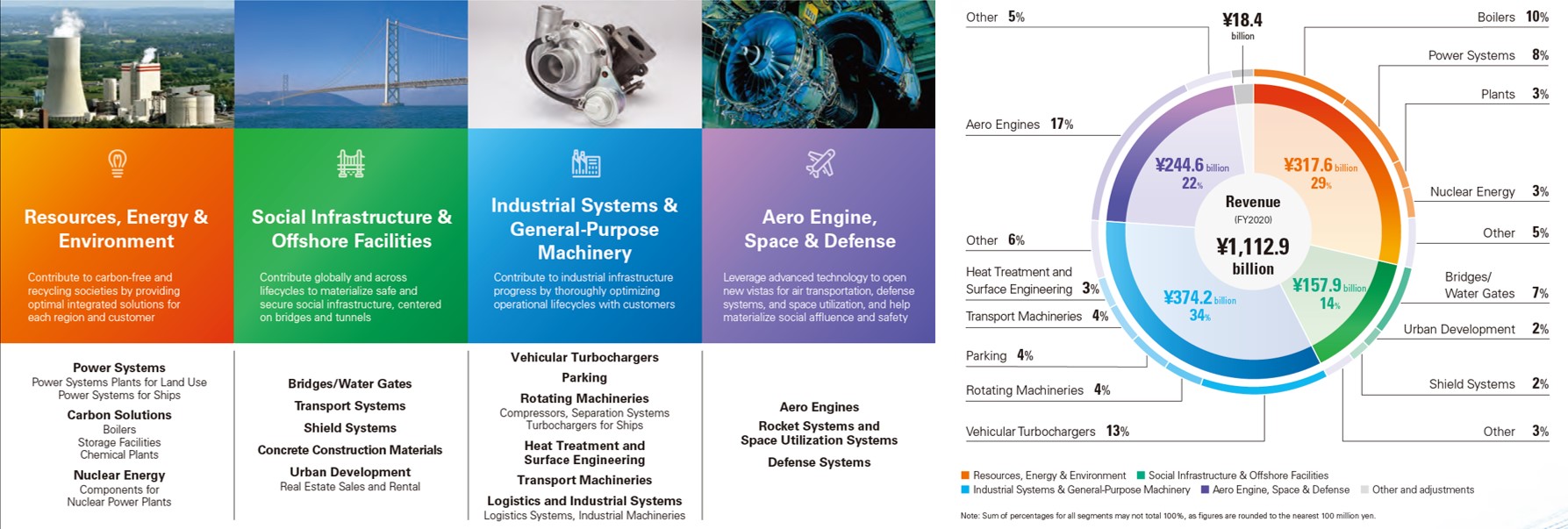 IHI 는 1차 세계대전 기간에는 선박과 군함 제조로 큰돈을 벌었고, 2차 세계대전 기간에는 일본군에 전투기를 제작하여 공급하면서 막대한 부를 축적하였다 (전투기 설계는 다른 회사). 전쟁이 키워준 회사라고 해도 과언이 아닐 정도. 현재 직원수는 3만명이 조금 안되고, 산업용 중장비 사업과 발전소에 들어가는 증기/가스 터빈 등의 에너지 분야 사업 그리고 전투기 엔진과 같은 방산 분야 사업이 가장 크다. 연매출 규모는 10 - 15조원이며, 주가는 큰 성장없이 주당 2000 - 6000엔 사이를 장기적으로 오르내리고 있다.