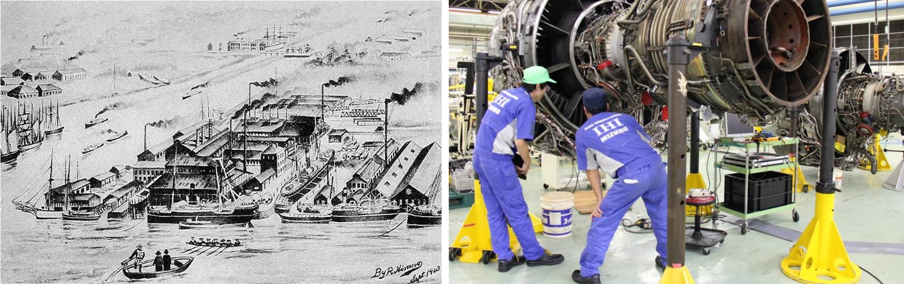 ※ IHI 가 창업한 1853년은 일본에서 꽤 역사적인 사건이 있던 해로, 그해 7월 미국 해군의 페리 제독이 증기동력식 철재 선박, 일명 쿠로후네(검은 배)가 일본 도쿄의 항구에 (당시 에도) 무력으로 들어왔던 사건이 있었다. 당시 에도항에 들어온 미국 선박은 총 4척이었는데, 모두 대포를 탑재하고, 증기 동력식 검은색 군함이었다. 당시 일본인들은 연기를 내뿜는 이런 철재 선박을 처음 보았다고 한다. 참고로 이 당시 한국은 조선말기 철종시대이며, IHI 가 창업한 해보다도 더 나중인 1856 - 1861년에 김정호의 대동여지도가 제작됐다.