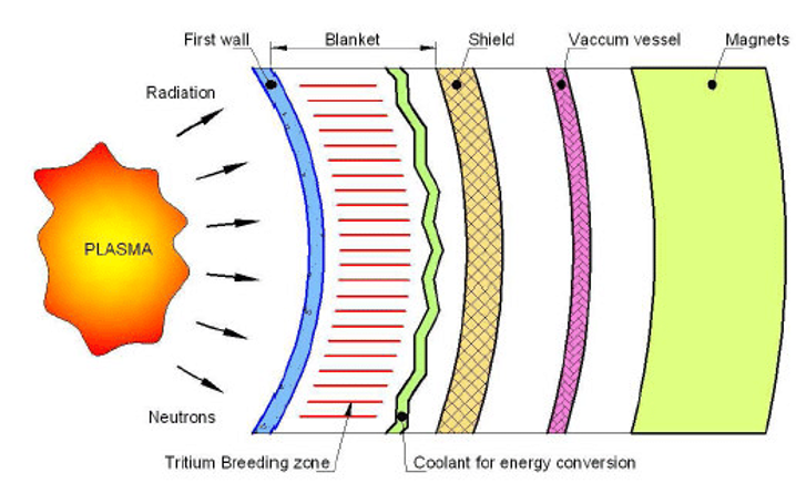 4) 블랑켓 장치 (Blanket: 중국, 유럽, 한국 등) : 진공 챔버 내부에 있으며, 전기를 만들기 위해 가장 핵심이 되는 소모성 부품. 어렵게 핵융합을 하는 이유도 결국 발전 (전기생산) 을 하기 위함. 실제로는 고온의 플라즈마로부터 열을 전달 받아 발전용 터빈을 돌릴 수 있는 가스를 고온으로 달구어 주는 부분이며, 고가 연료인 삼중수소(T)를 만들기 위해 리튬을 처리할 중성자를 흡수하는 장치이기도 하다. 위에서 설명한 가열장치에 사용한 에너지보다 블랑켓 장치가 흡수하는 에너지가 적다면, 이 장치는 그냥 돈만 버리는 장치가 된다. 현재까지는 대부분의 Tokamak 이 돈만 먹는 장치 수준이다. 현재 자체 Tokamak 장치를 가지고 있는 국가들은 모두 자신들만의 고유한 소재를 사용한 블랑켓 장치를 사용하는 것 같다.
