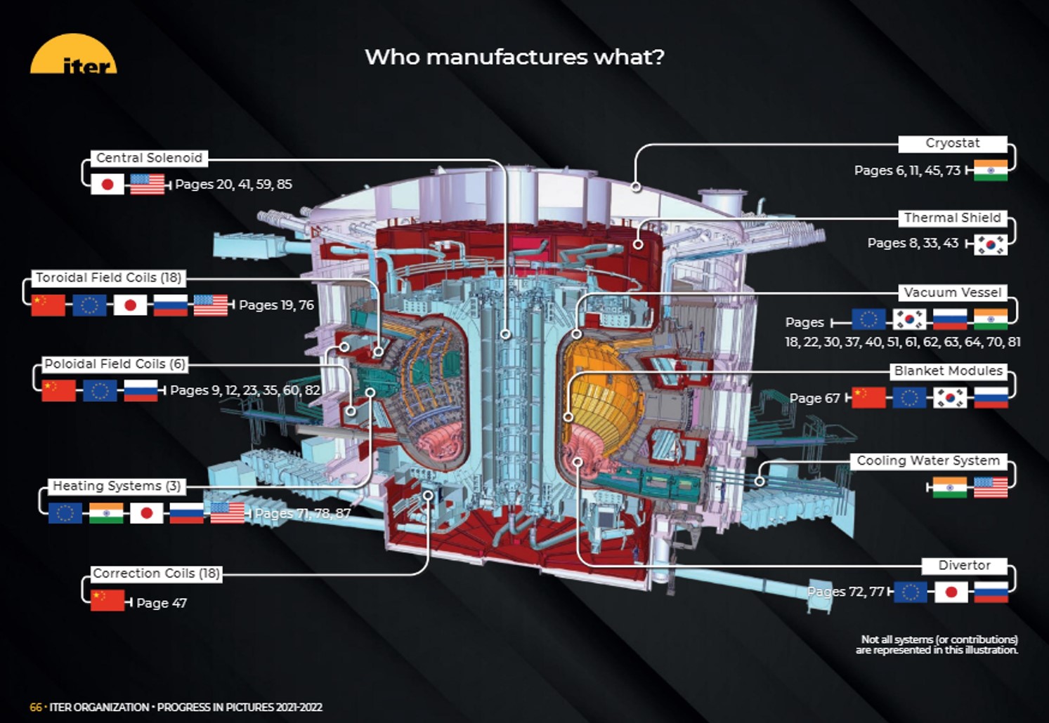 1) 초전도 코일 (Coils: 중국, 유럽, 일본 등) : 핵융합 현상을 유지하기 위한 핵심 부품. 도넛 모양의 진공 챔버 바깥에 설치되어 챔버 안에 있는 고온의 플라즈마가 챔버 내벽에 닫지 않도록 강력한 자장을 만들어 준다. 챔버 안은 1억도의 엄청난 고온이지만, 초전도 코일은 극저온을 유지해야하는 문제를 해결해야 하는데, 이러한 극강의 온도차를 유지하는 단열처리는 위 그림 상으로는 한국에서 담당하는 것으로 표시되어 있다.
