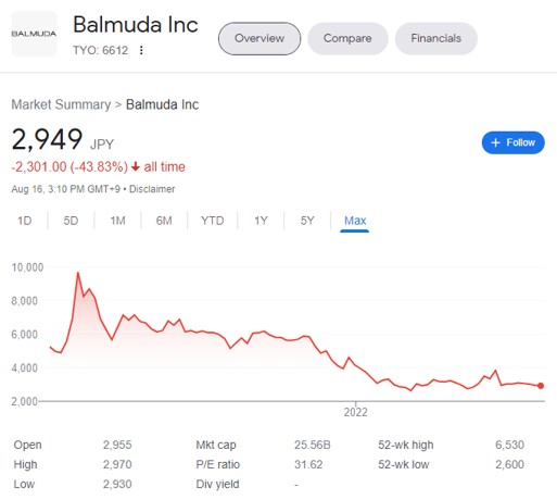 아래 주가 그래프에서도 알 수 있다시피, 2022년 상반기 기준 발뮤다 주가는 2020년 상장가보다도 훨씬 아래에 있다. 아마도 향후 성장 가능성에 대해 일본 내에서는 의문을 품는 경향이 강한 것 같다. 얼마전 뜬금없는 휴대폰 제품 출시도 이런 맥락에서 주가 방어를 위해 추진된 듯하지만, 시장의 반응은 싸늘했다. 유독 한국에서만 사랑받는 분위기가 계속 유지된다면, 휠라(Fila) 처럼 언젠가 한국 기업이 외국 본사를 인수할지도 모르겠다. 지금 주가로는 발뮤다의 1년 매출인 2천억원만 있으면 지분 70% 이상 인수가 가능하다.