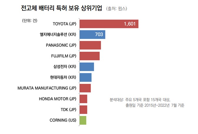 전고체 배터리는 액상 전해액을 사용하는 배터리에 비교되는 고체형 배터리를 말하는데, 건식/습식으로 나누어 언급하는 경우도 있다. 아무튼 위에서 언급한 것처럼, Toyota 자동차 기업철학으로는 현재의 배터리 기술은 자동차에 사용할 수 없는 원시적 기술로 보고, 실제 사용 가능한 폭발 위험이 없고, 에너지 밀도도 현재의 액상 배터리에 비해 몇 배나 높은 전고체 배터리 기술개발에 많은 투자를 하고 있다. 특허청 통계에 따르면, 주요 15개국 출원특허 기준으로, 세계에서 전고체 배터리 관련 가장 많은 특허 보유 기업은 일본 Toyota 이며, 2위인 한국 LG에너지솔루션의 2배가 넘는다.