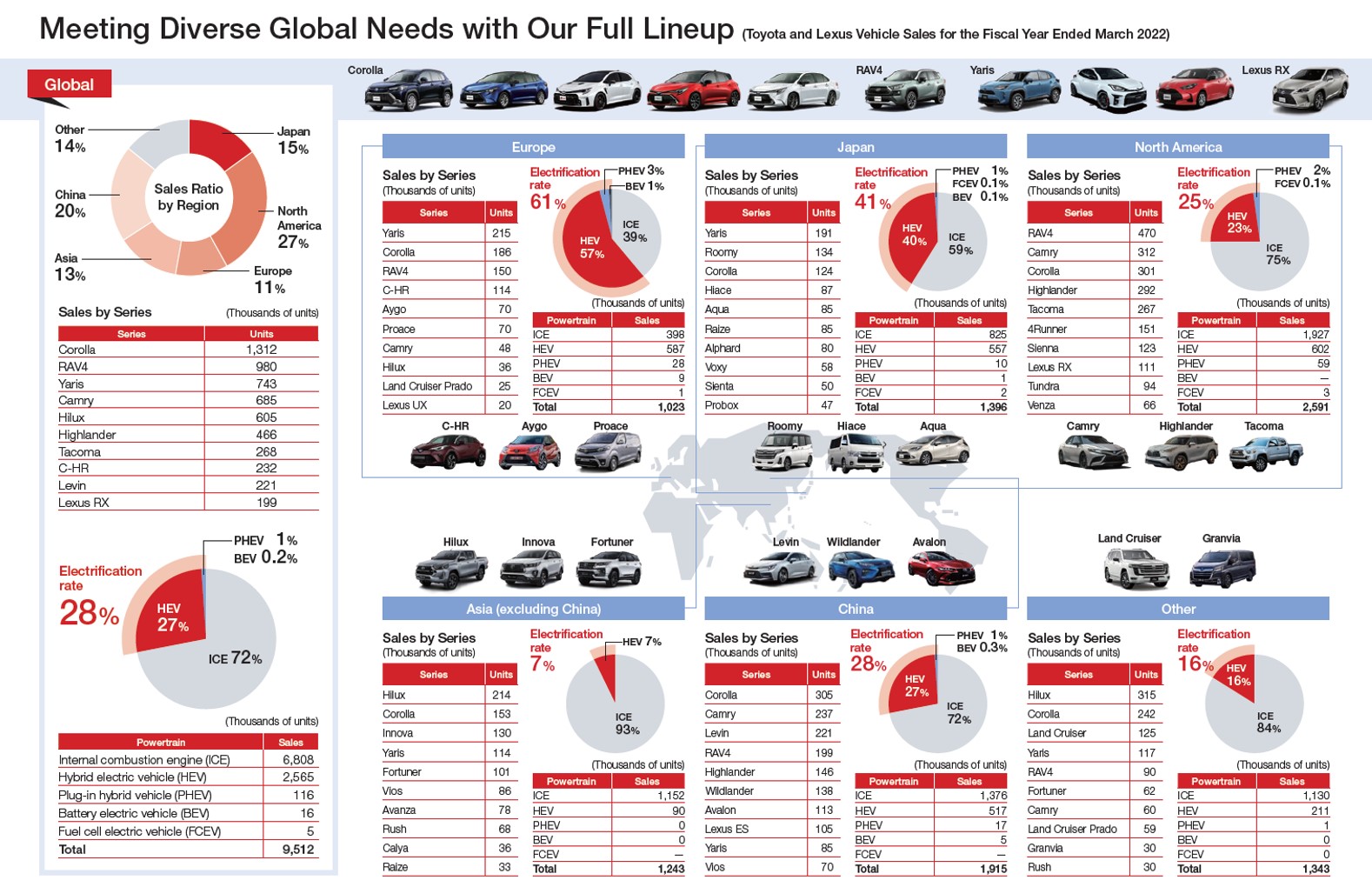 일본에 본사가 있는 Toyota 자동차는 생산 차의 15% 만이 일본에서 팔리고, 그나마도 수익이 크지 않은 중소형차가 대부분이다. 85% 가 넘는 대부분의 생산 차는 외국에서 팔린다. 그중에서 중국과 동남아 등의 아시아, 중동과 남미 지역에 팔리는 비율도 미국과 유럽 못지않게 높은 편이다. 즉 전 세계에 지역적 편중 없이 전체적으로 잘 팔리는 차를 만들고 있다.