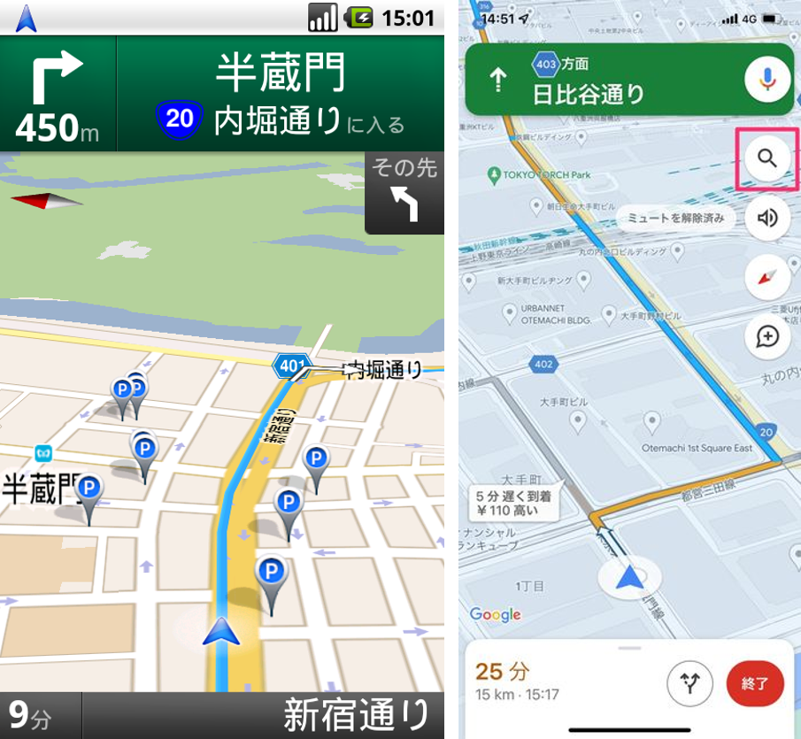 한국에서는 Google Map 이 자동차 내비게이션 서비스를 제공하지 않지만, 한국만 그렇다. 필자의 경우, 한국에서 사용하던 휴대폰과 Google Map 을 그대로 일본에서 사용했는데, 한국에서 안되던 내비게이션 기능이 일본에서는 저절로 활성화되어 사용 가능했다. 기본 설정이 한국어여서인지 길안내도 한국어 남자 목소리로 나왔고, 익숙한 용어라 이질감을 느끼지 못했지만, "급한 우회전" 이라는 안내 멘트가 나왔을 때는 잠시 어쩌라는 건지 몰랐다. 하지만 휴대폰 화면을 보니, "우회전 방향 유턴"을 말한다는 걸 알 수 있었다.
