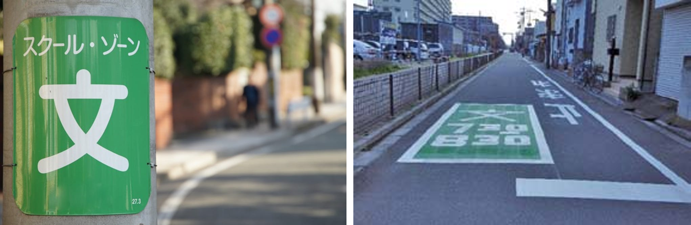 스쿨존 도로교통법은 전 세계 공통이라, 일본에서도 감속 운전해야 하고, 잠깐이라도 주차와 정차 모두 안된다. 보통 연녹색 바탕에 흰색의 한자로 '글월 문(文)' 을 써서 표시하니 이 표시가 도로 위나 가로등 혹은 골목길 전봇대 등에 표시되어 있으면, 운전에 각별히 주의해야 한다. 영어로 School Zone 이라고 표시된 곳은 거의 못 본 것 같다.