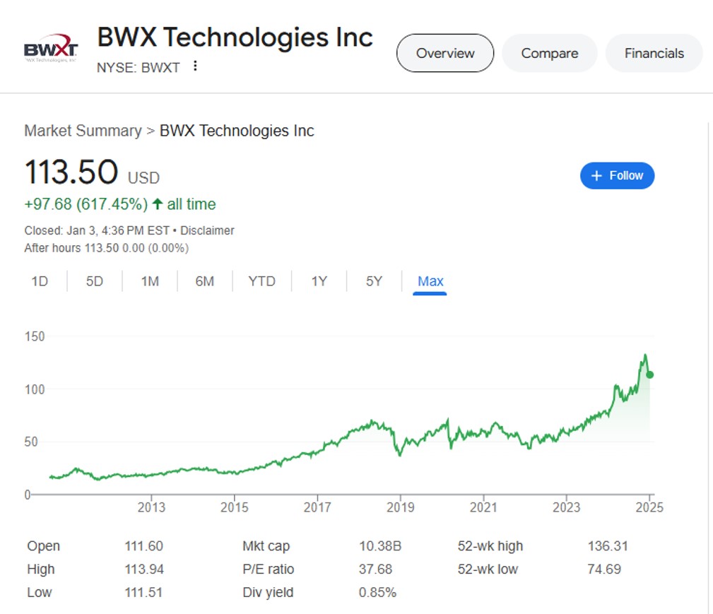 한국에서는 아직 비슷한 회사조차 없고, 아는 사람도 거의 없는 미국 원자력 핵심기술 보유회사, BWX Technologies.